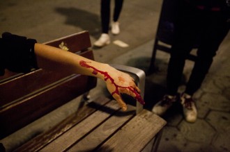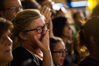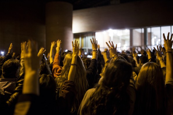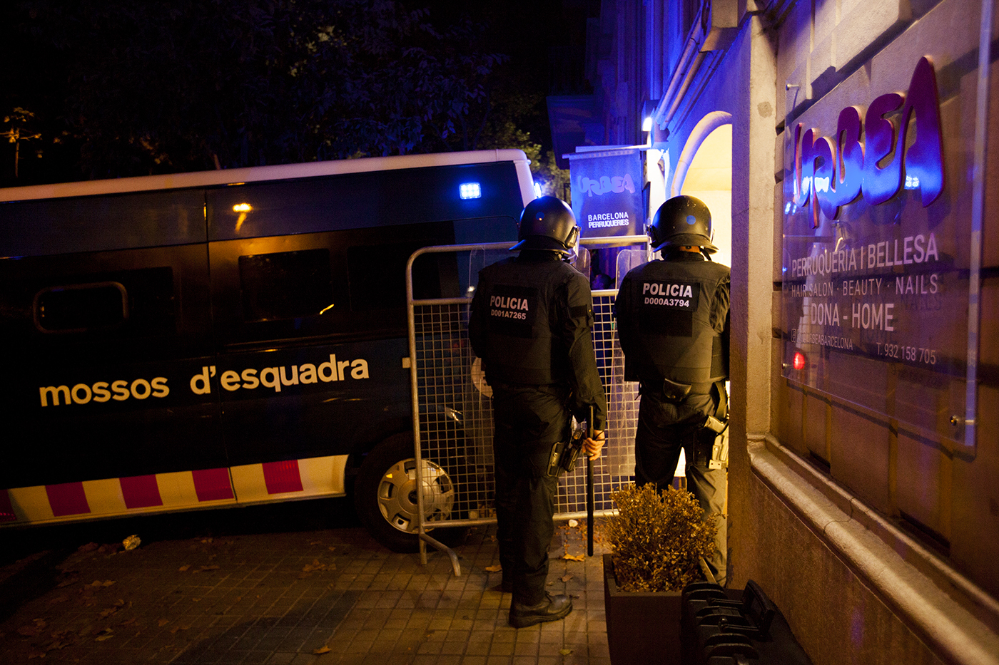 Ciudadanos catalanes haciendo resistencia pacífica enfrente los colegios electorales ante nuevas amenazas de intervención por parte de los cuerpos y fuerzas de seguridad del Estado - Guardia Civil y Policía Nacional - la tarde del domingo 1 de octubre de 2017 con la finalidad de defender los votos depositados durante toda la jornada. Sabadell, Barcelona, 1 de October de 2017.
